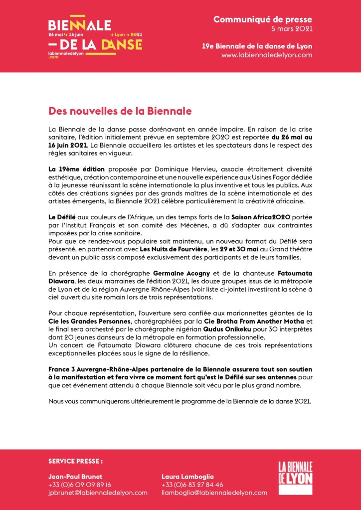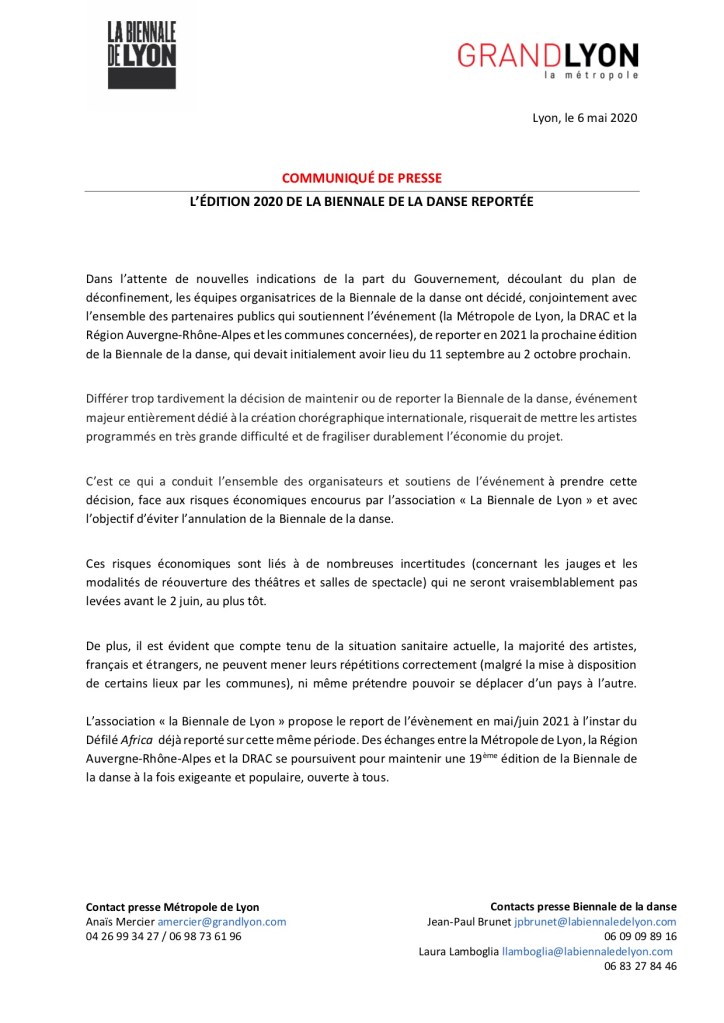 Bonjour, voici le communiqué de presse de la Biennale de la Danse à Lyon. Sachez, que nous nous mettons dès maintenant à la proposition de rendez-vous sur Saint Etienne !!! Tellement hâte de renouer le contact et la danse avec vous tous !!